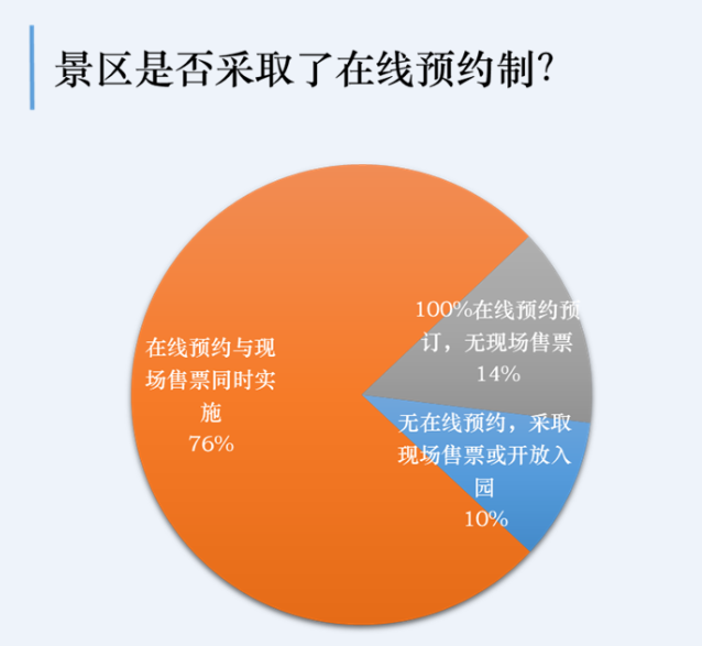 调研结果显示,在线预约成为了“常规武器”,超过90%的受调研景区表示已经实行线上预约,其中14%的景区实行了100%线上预约,取消了现场售票。
