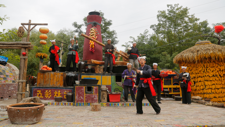 10月13日下午,赤牛坬村迎接了一波来自外地的游客,村民们表演了《高高山上一头牛》《打平伙》等一些列陕北民俗节目。不少游客在观看节目后,还参与了互动共同扭起陕北大秧歌。