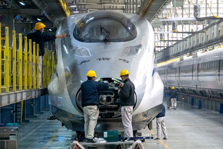 1月21日,除夕当天,中国铁路西安局集团有限公司西安动车段的动车组机械师正在进行动车组受电弓动态检查。
