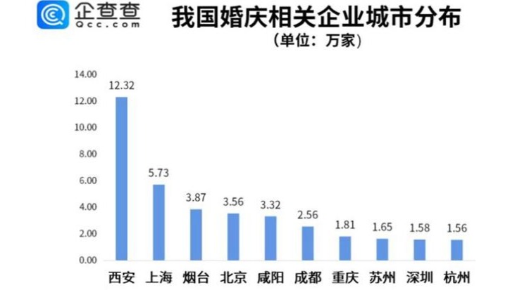 从城市分布来看,西安以12.32万家婚庆相关企业位居榜首。上海、烟台分别有婚庆相关企业5.73万家、3.87万家,排名前三。此后依次为北京、咸阳、成都等城市。