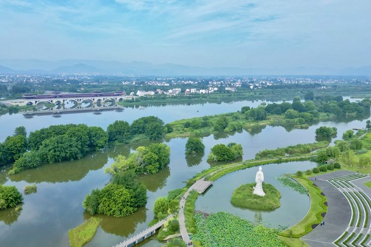 汉水女神像立于荷塘之中。