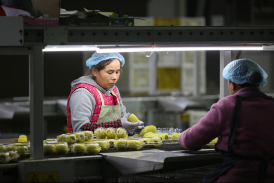 陕西猕猴桃迎采收旺季,正在流水线上选果的果农。