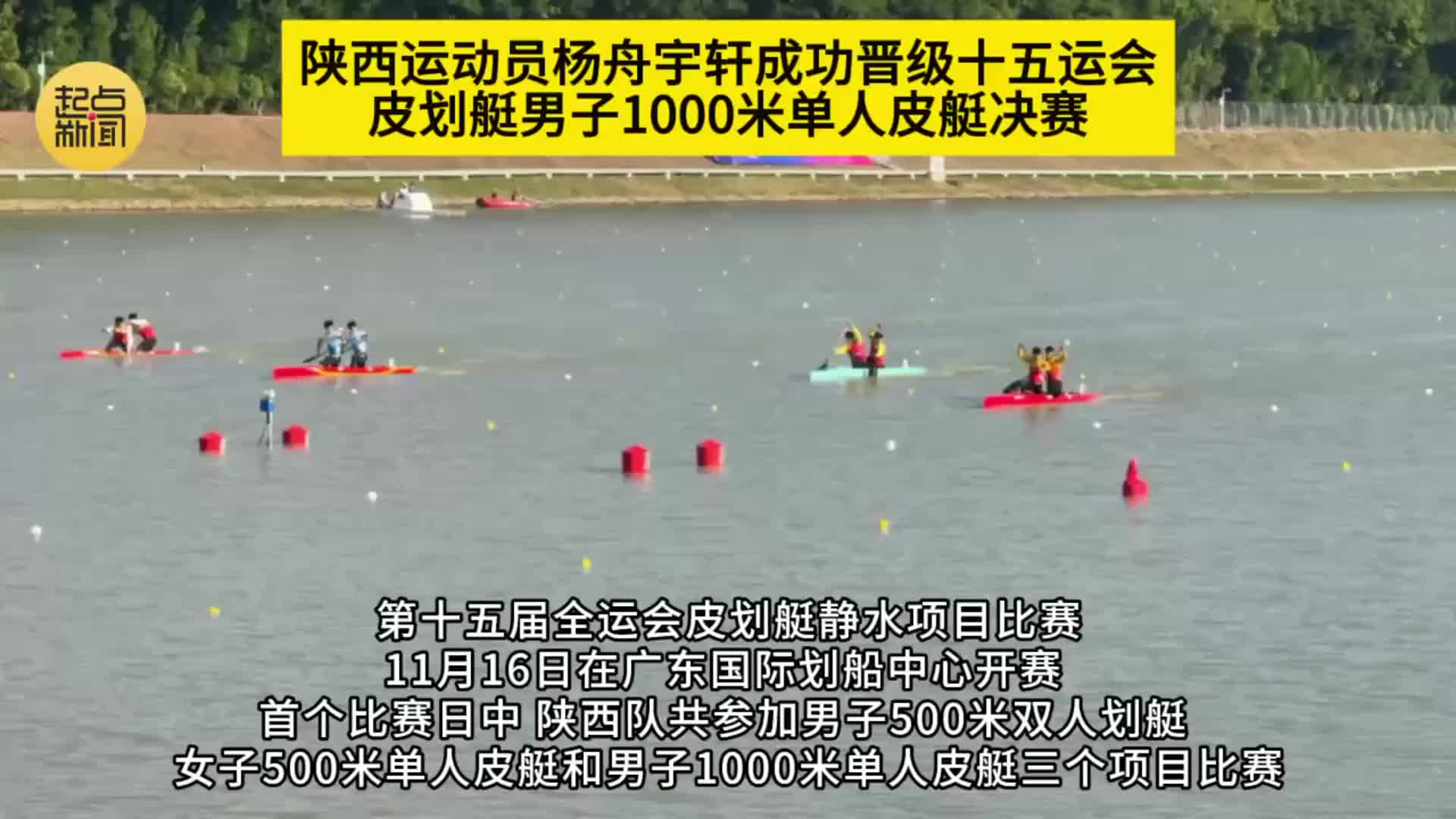 第十五届全运会皮划艇静水项目比赛11月16日在广东国际划船中心开赛,该项目将决出12枚金牌。首个比赛日中,陕西队共参加男子500米双人划艇、女子500米单人皮艇和男子1000米单人皮艇三个项目的比赛。其中今年全国青年锦标赛男子1000米单人皮艇冠军杨舟宇轩在小组赛发挥出色,一路领先,以小组第一晋级半决赛。在半决赛出发落后的情况下奋起直追,杨舟宇轩最终以第三成功晋级男子1000米单人皮艇决赛。