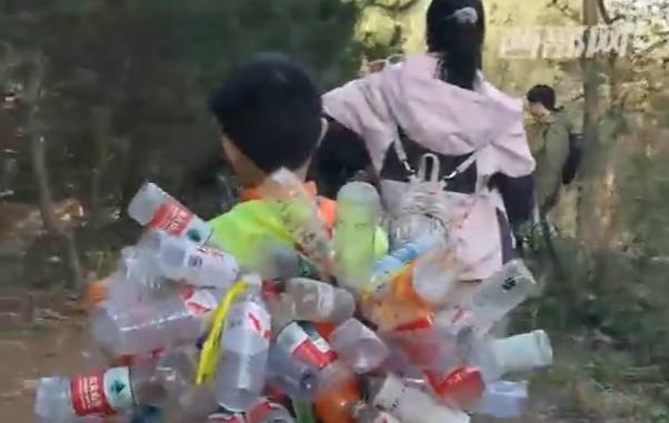 小男孩和志愿者们把瓶子串起来背下山,好像变成了一个可爱的小刺猬,既方便运输,还能够在下山的路上唤醒大家的环保意识,保护好我们的绿水青山