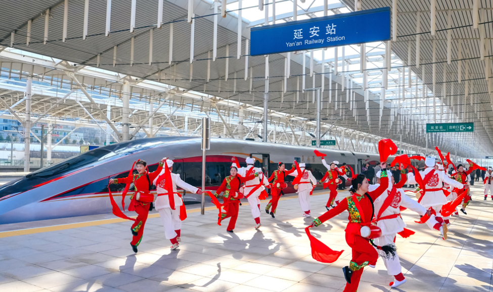安塞腰鼓与“复兴号”列车在延安站同框。刘一江 摄