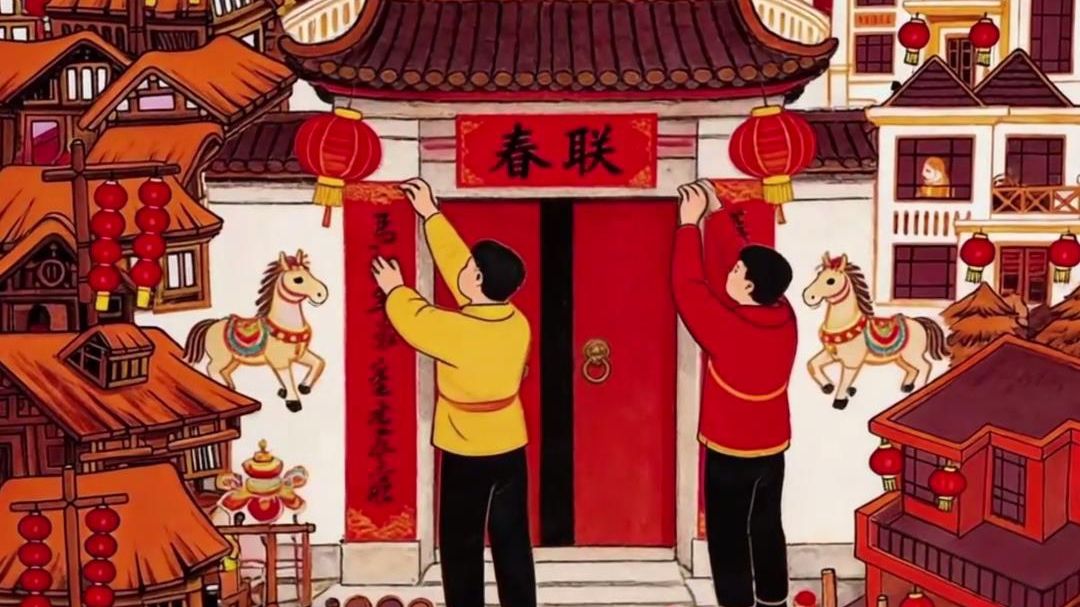 红联焕彩贴门头,爆竹声声辞旧愁