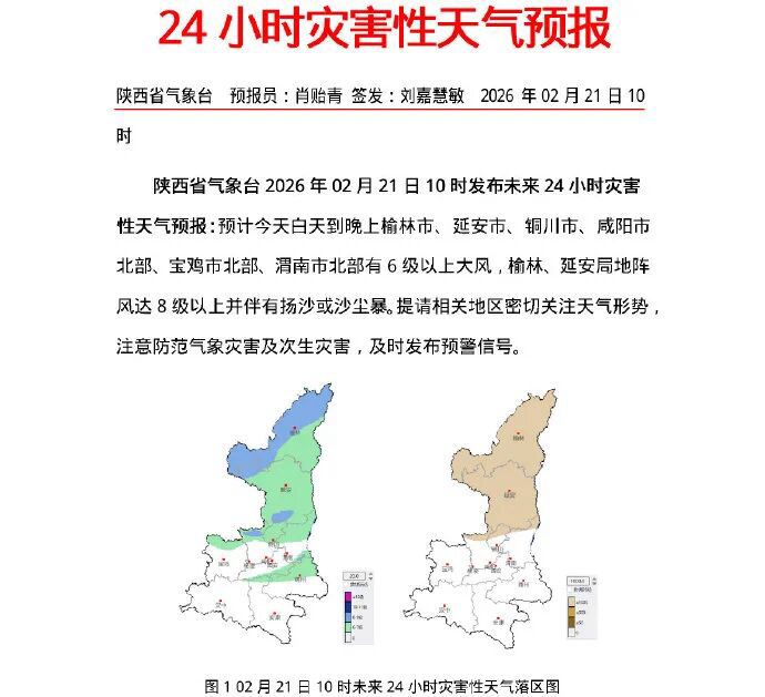 陕西省气象台今天(2月21日)10时发布未来24小时灾害性天气预报:预计今天(2月21日)白天到晚上榆林市、延安市、铜川市、咸阳市北部、宝鸡市北部、渭南市北部有6级以上大风,榆林、延安局地阵风达8级以上并伴有扬沙或沙尘暴。提请相关地区密切关注天气形势,注意防范气象灾害及次生灾害,及时发布预警信号。