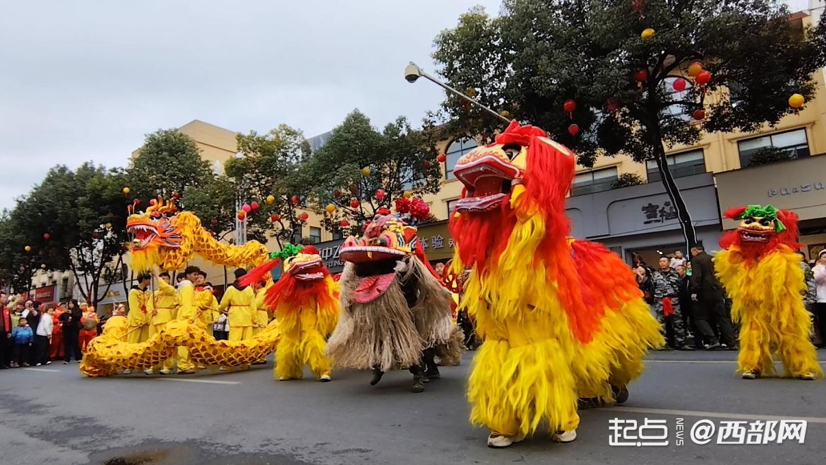 非遗技艺活态传承是本次巡游的一大亮点。城关镇方阵的舞狮表演率先登场,腾跃、翻滚的雄狮惟妙惟肖,瞬间点燃现场气氛。该方阵表演者吴显峰介绍,舞狮在当地有着风调雨顺、国泰民安的美好寓意,希望通过表演将新春祝福传递给全县群众。
