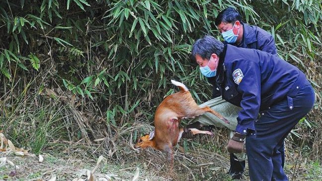 宁强县积极开展保护野生动物宣传教育,严禁猎杀、贩卖、食用野生动物。图为日前该县野生动物管理站和县森林公安分局汉源派出所的干警,把一只迷路的省级重点保护动物黄鹿放归巴山林区。刘炳林 摄