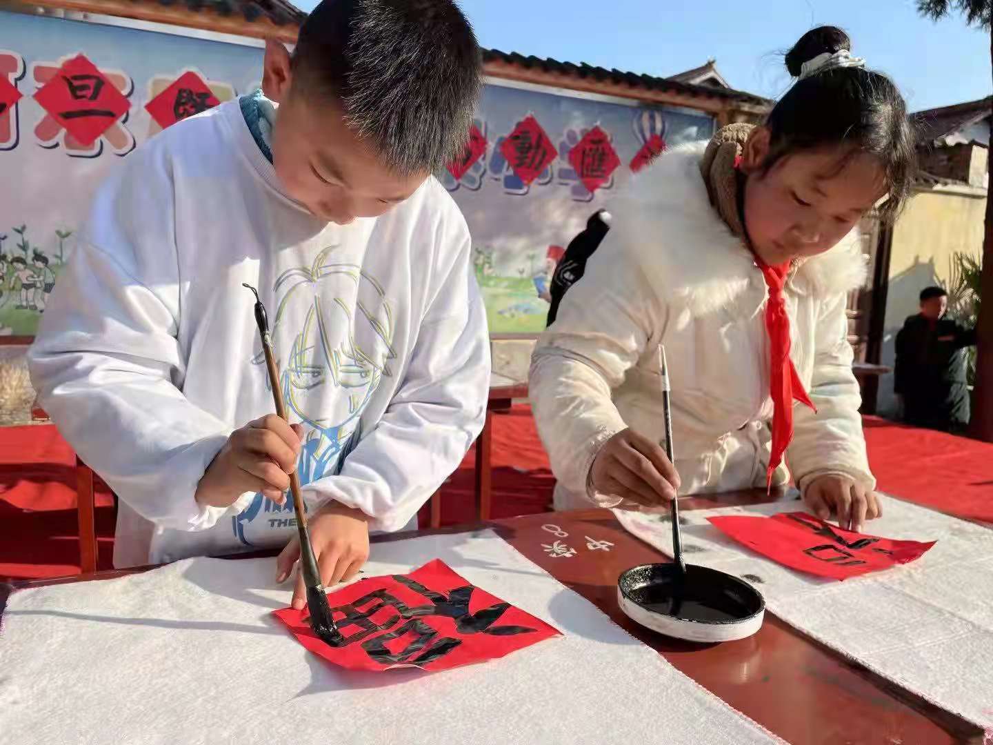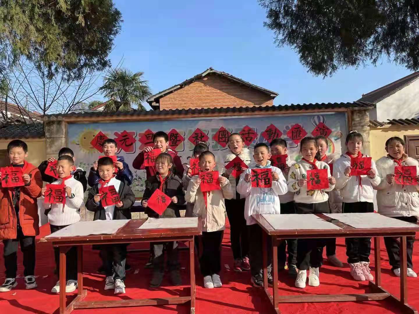 汇演伊始,师生登台挥毫泼墨写福字。一撇一捺中,笔落福至,跃然鲜红的纸上。 歌曲《萱草花》、《只要平凡》,舞蹈《祝福来》、《我是中国娃》、《彩色的中国》,诗朗诵《中华好少年》等精彩纷呈的文艺节目接连上演,表达了全校师生对祖国美好的祝福。当天,喜庆的“福”字高高挂在校园里,孩子和老师们亲手制作的窗花、对联、贺卡,让校园增添了喜庆的节日氛围。孩子们在丰富多彩的活动中,感受传统文化和佳节特有的魅力。