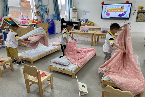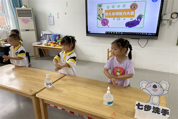 活动根据《3——6岁儿童学习与发展指南》不同年龄阶段幼儿所应具有的基本的生活自理能力,制定了各年级的比赛项目。比赛重视全员参与, 让所有的幼儿都能得到锻炼。通过年级组幼儿与幼儿之间的比赛形式培养幼儿的自理能力,进一步增强孩子的独立意识。中班组为七步洗手、整理玩具、叠被子比赛;小班组为穿袜子穿鞋子、整理水彩笔 、舀豆子;活动中,有的小朋友身手不凡,动作灵活迅速,很快就完成了任务。孩子们都表现出了很高的热情,各个班级都不时地爆发出孩子们加油、呐喊声和欢笑声。