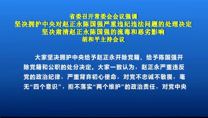 西部网讯(陕西广播电视台《陕西新闻联播》记者 王嘉毅)日前,陕西省委召开常委会会议,传达中央纪委关于全国人大原内务司法委员会副主任委员、陕西省委原书记赵正永和陕西省政府原党组成员、副省长陈国强严重违纪违法问题的处理决定。省委书记胡和平主持会议。