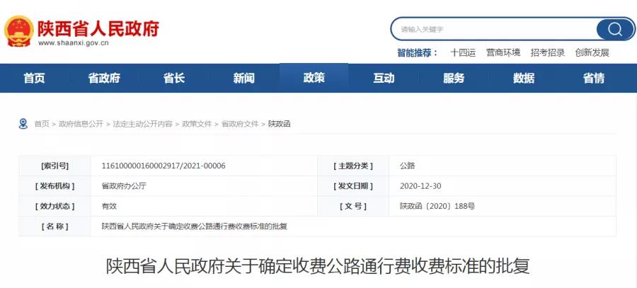 陕西省人民政府发布关于《确定收费公路通行费标准的批复》,原文如下: