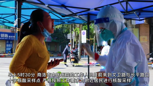 当日5时40分,商洛市中医医院的工作人员穿上防护服,戴上护目镜和防护帽,提前来到位于文卫路与长平路口的20号核酸采样点,为这里的居民进行核酸检测。