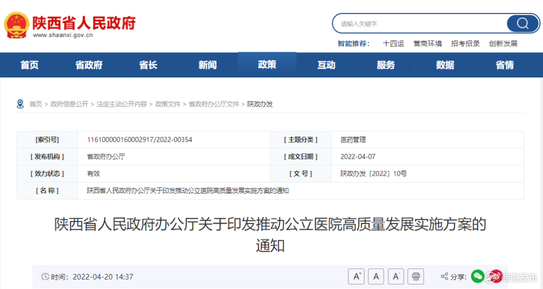 4月20日,陕西省人民政府网站发布《陕西省推动公立医院高质量发展实施方案》,部署陕西在打造医学高峰高地、加强临床专科建设、引进培养具有国际国内领先水平的中西医人才、改革人事管理制度和薪酬分配制度等方面的工作;明确了陕西到2025年公立医院发展方式将从规模扩张转向提质增效,运行模式从粗放管理转向精细化管理,资源配置从注重物质要素转向更加注重人才技术要素;为更好提供优质高效医疗卫生服务、防范化解重大疫情、突发公共卫生风险和建设健康陕西提供有力支撑。