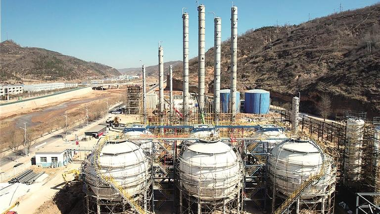 志丹县工业园区的10万吨/年高端有机胺项目建设现场(3月12日摄)。