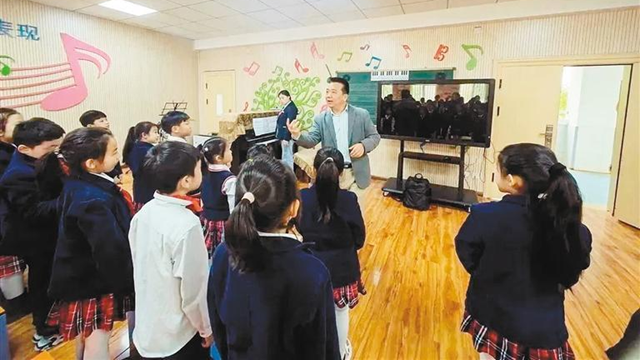 在曲江十四小,屈歌博士为校合唱队学生进行现场指导。 受访学校供图