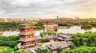 如今,曾经独领风骚的盛唐风华,被浓缩在大唐芙蓉园。依300亩芙蓉湖水域而建的紫云楼、仕女馆、御宴宫、杏园、芳林苑、凤鸣九天剧院、唐市等众多仿古建筑,阙亭拱卫间,馆桥飞渡处,重檐庑殿上,美轮美奂尽显繁华。
