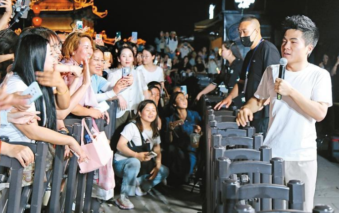 董宇辉和粉丝互动宣传西安。 (记者 谢伟 摄)
