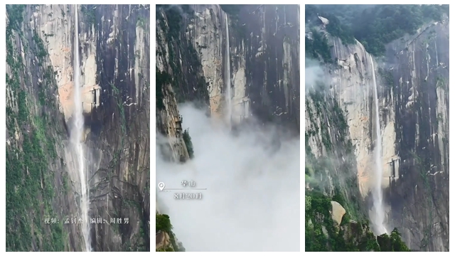 8月20日,摄影师在华山拍摄到雨中飞瀑。山峰高峻,水流从悬崖峭壁上飞溅而下,气势恢宏,再现了诗中“飞流直下三千尺”的壮观景象。