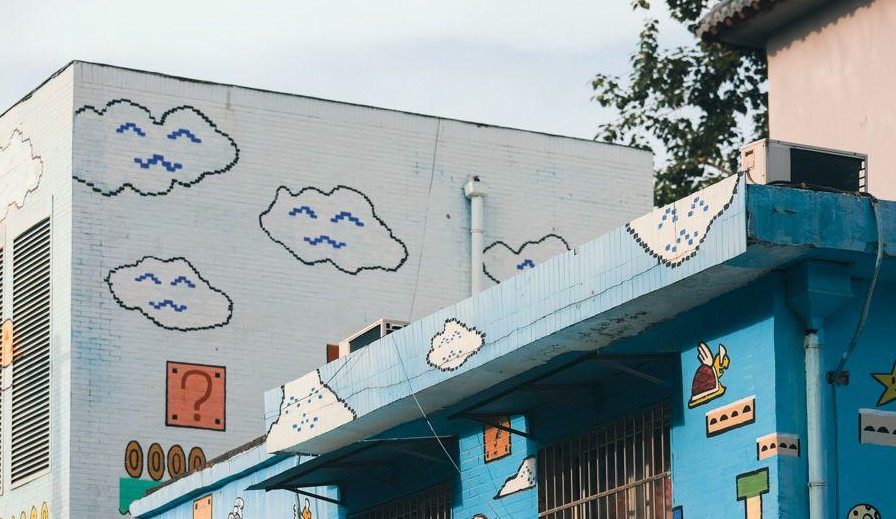 小巷沿街的墙体以蓝色为主,艺术再现经典老游戏“超级玛丽”的游戏关卡。