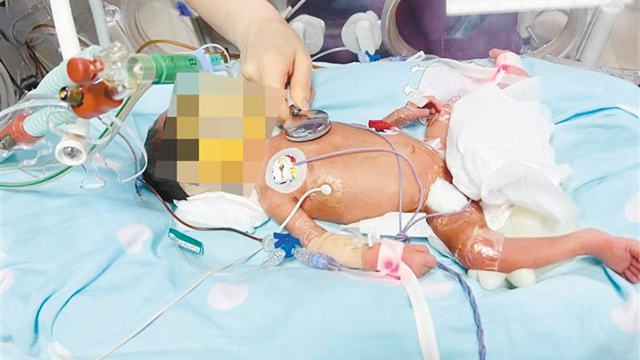 今年3月初,胎龄仅28周的小天赐(化名)意外早产。一个多月后,小天赐因为严重腹胀前往西北妇女儿童医院新生儿科就诊。检查显示,原本小小的身体因为肠壁水肿,胃肠道血管出现缺血,随时有继发新生儿小肠坏死性结肠炎的风险。更加雪上加霜的是,小天赐被查出动脉导管未闭,就诊时心衰指标升高,已经严重影响其消化、呼吸及心脏功能。原本出生仅1000克的小天赐,此时已连续2周体重零增长,仅有1400克。