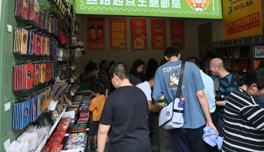 中国邮政集团有限公司西安市分公司携手大唐西市,在丝路起点设立“大唐西市丝路起点”主题邮局,一同亮相的还有鲤鱼传书信筒等主题系列邮品。