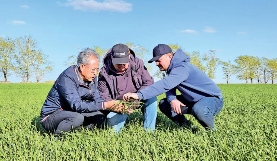 西北农林科技大学教授张正茂(左一)与哈萨克斯坦专家观察农作物生长情况(资料照片)。 受访者供图