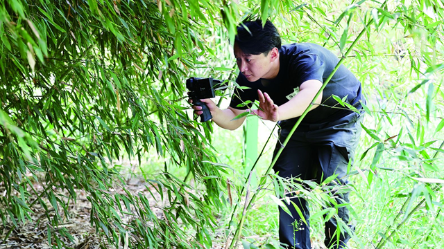 靳大奥在草丛中排查宠物猫可能“出逃”的路线。