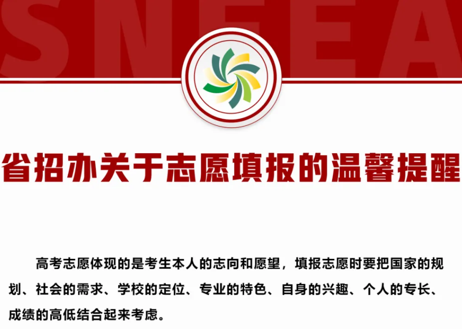 特别提醒:考生须对所填志愿负责。在录取过程中不受理考生以任何理由提出的要求放弃某一批次、某一高校、某一专业志愿转而参加后续批次、其他高校、其他专业录取的申请。招生院校以考生自愿放弃为理由提出的退档要求,也将不予同意。因此,考生在填报志愿之前,须认真阅读拟报考院校的招生章程和我省有关招生工作规定,按照网上填报志愿的说明及相关要求,根据高校招生计划,严格按照规定程序填报志愿,确保志愿信息准确、有效。考生未填报志愿或将志愿填报在规定栏目以外而影响录取的,由考生本人承担责任。其他任何机构和个人不得代替或干预考生填报高考志愿。