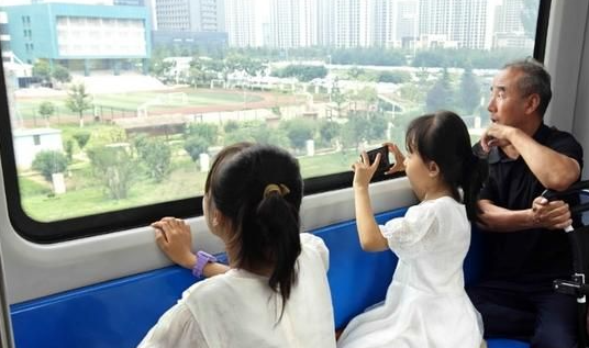 车厢里,七岁的小男孩顶顶正给小伙伴打视频,“直播”窗外风景,兴奋地喊:“我坐的是云巴!”爸爸刘先生说,曾在重庆坐过轻轨,西安现在也有云巴了,交通越来越便利。刘先生住在鱼化寨附近,看到有试乘活动就带着正放暑假的儿子来了,没想到人这么多。“云巴在西安是独一份,孩子也好奇,体验下长长见识,回家顺便再写个小作文练练笔。”刘先生笑着说。