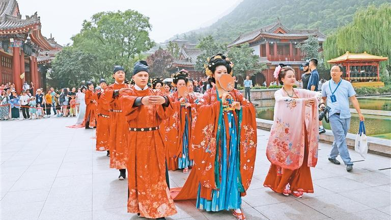 上午10时,华清宫第十五届中华七夕情人节唐宫婚典正式拉开帷幕。来自乌兹别克斯坦、哈萨克斯坦等国家的友人以及在中欧班列、爱菊集团等为共建“一带一路”工作奉献的中国青年,以盛唐妆造装扮,着凤冠霞帔,由大唐NPC“高力士”宣旨,在宫廷仪仗队的引领下从华清宫望京门入宫,依次体验传毡、跨马鞍、帝妃赐婚、合卺礼、共结镜钮、新人交拜、敬天祈福等活动环节,亲历全场景还原的唐宫婚典,感受气势恢宏的大唐风韵,欣赏风光旖旎的皇家园林。