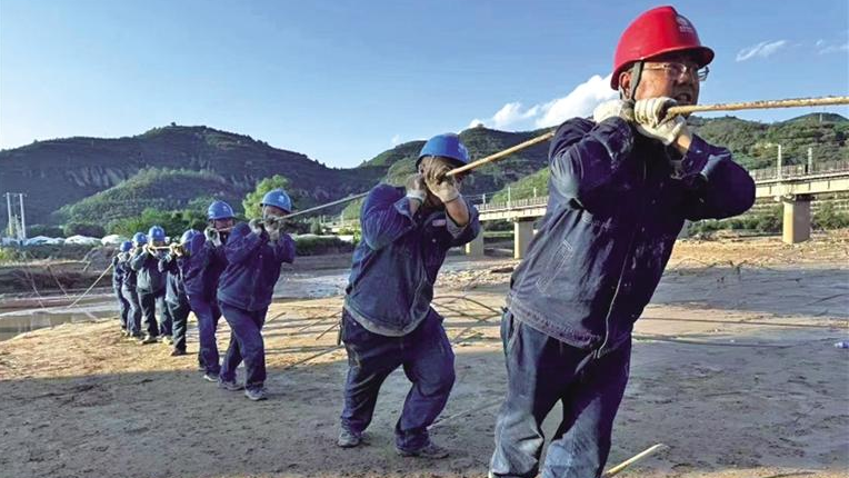 抢险支援队队员肩扛手抬,将导线、电缆等物资运往曹坪镇施工现场。物资到位了,崭新的杆基立好了,一根根电缆再次从山谷深处向远方延伸。抢险支援队以最快速度、最短时间完成了此次抢修任务,让当地群众恢复正常用电。