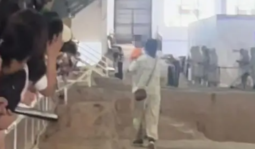 8月17日,有网友在社交平台发布视频称,其在游览秦始皇帝陵兵马俑时,一女子怀抱孩子突然跨过护栏,走在兵马俑坑的坑道边上。
