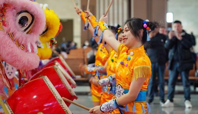 活动现场,大红灯笼高高挂起,浓郁的新春气息扑面而来。率先映入眼帘的是传统鼓舞表演,击鼓者们身着鲜艳服装,他们的每一个动作都干净利落,或腾跃,或嬉戏,激昂的鼓声与旅客们的欢呼声和掌声交织成一曲热闹的乐章。随后,提线木偶戏和皮影戏相继上演,细腻的表演和精彩的剧情,让旅客们仿佛穿越时空,领略到古老文化的独特魅力。