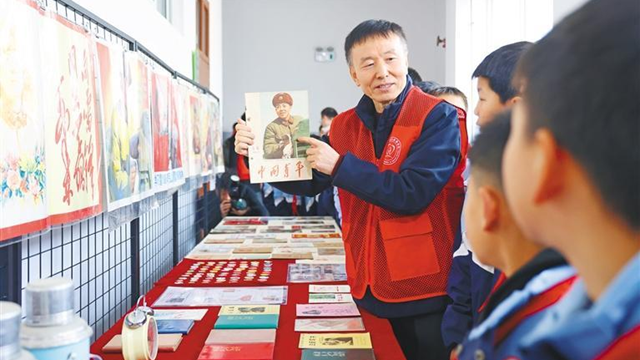 2月28日,宝鸡上善公益联合会志愿者周建华为宝鸡市金台区金河尚居小学的学生展示雷锋主题藏品。记者 刘芊羽摄