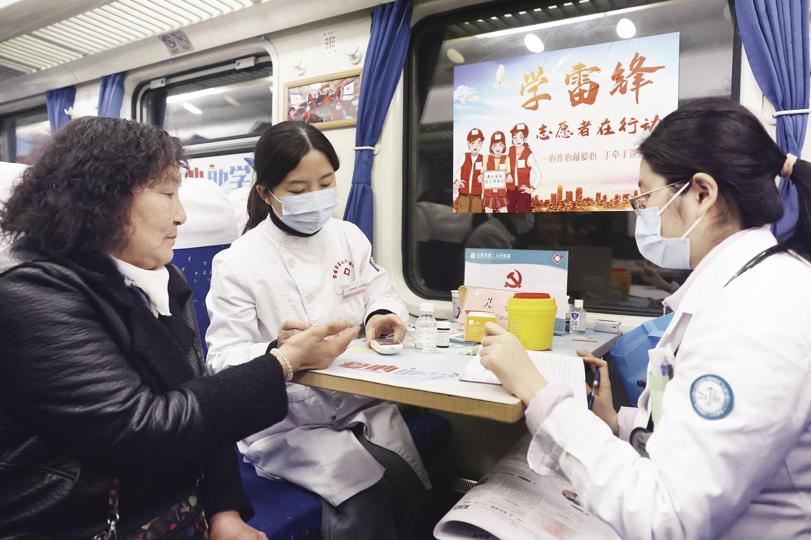 3月5日,穿梭在秦岭山间的6063次公益慢火车上,由中国铁路西安局集团有限公司(下称西安铁路局)西安客运段联合西安理工大学、宝鸡市第二人民医院共同开展的“学雷锋,我们在行动”主题活动,正为沿线乘车的老乡带去融融暖意。