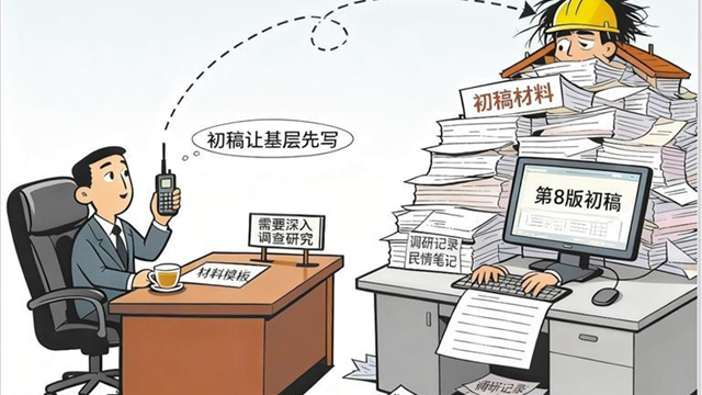撰写调研报告是政策性、思想性、业务性都很强的工作,必须认真对待。然而,部分机关工作人员为图省事,将本应亲赴一线调研并撰写的调研报告让基层“拿初稿”,这实则是形式主义、官僚主义回潮。基层是政策落地的“最后一公里”。基层干部精力本应聚焦群众“急难愁盼”,却困于替别人“代笔”,身心俱疲。这种“材料依赖基层”的现象亟须破除。机关工作人员应扛起调研主责,沉到一线亲拟调研报告。唯有如此,才能从根本上减少对基层“初稿”的依赖,切实为基层松绑减负,让基层干部把更多时间和精力放到服务群众上,让实干回归民生本位。