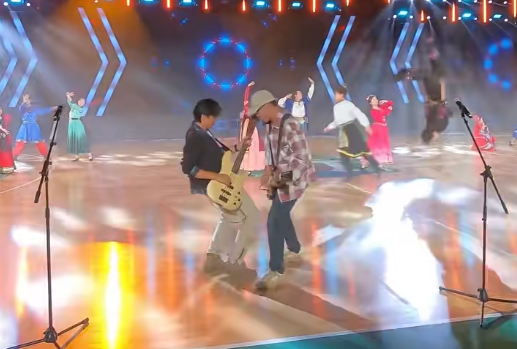10月28日,中国文明乡风大会“村BA”群众体育交流活动现场,观众与农民兄弟乐队主唱老宝共同唱响《南泥湾》《映山红》《我和我的祖国》等歌曲,嗨爆赛场。