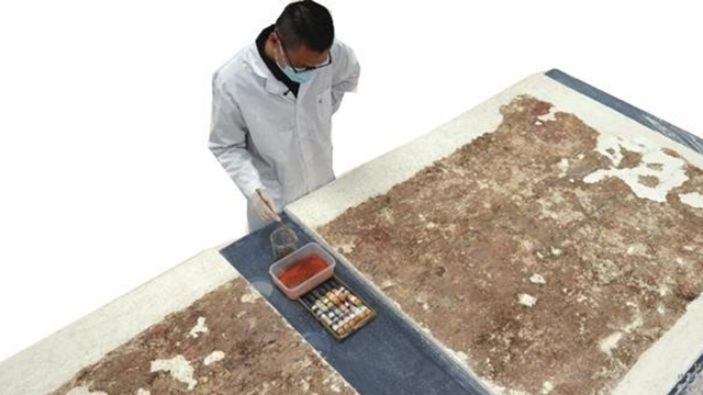 有了这张“路线图”,2017年11月,团队开始了长达11个月的“拼图之旅”。陕西历史博物馆壁画修复师张锟描述:“每一块残片都不规则,而且脆弱得像饼干,稍不留神就会碎。我们先将残片按纹路、颜色初步分类,再开始逐片比对、定位。”