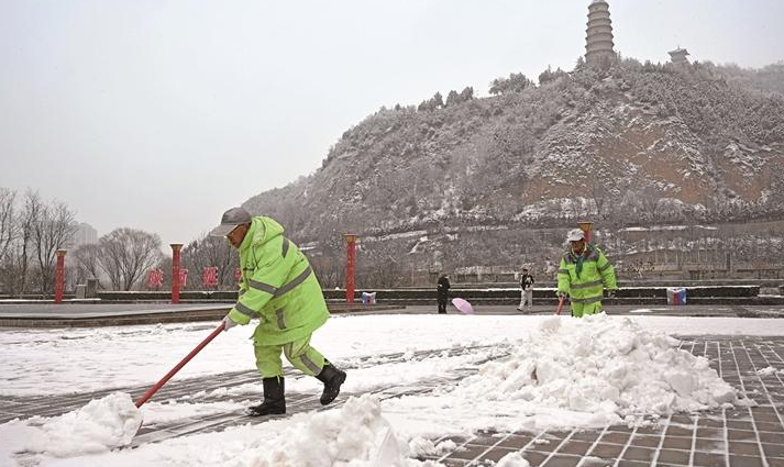 12月11日晚至12日白天,延安市迎来入冬后的第一场雪。图为环卫工人在安澜门广场清理积雪。 通讯员 王德荣摄