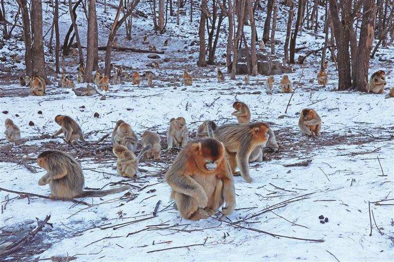 1月12日,陕西周至国家级自然保护区玉皇庙金丝猴监测基地,成群的川金丝猴在觅食、活动。作为我国川金丝猴分布的最北限和最集中地区之一,陕西周至国家级自然保护区通过冬季科学适度投喂、常态化监测保护等举措,为川金丝猴营造了良好的生存环境。近年来,随着秦岭生态保护和修复力度持续加大,陕西周至国家级自然保护区的川金丝猴种群不断“添丁进口”。该监测基地的川金丝猴种群数量从2022年的180余只增至如今的340余只,仅2025年就新增40余只幼猴。保护区川金丝猴种群数量也从20世纪80年代的1200余只增长到2000只左右。