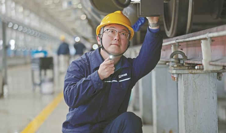 强楠在对动车组转向架进行检查。