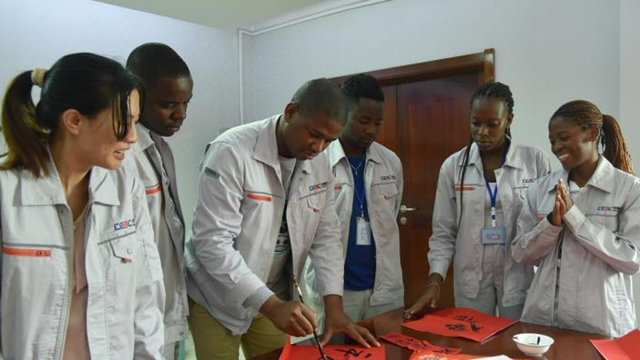 图为春节文化活动现场,中外员工体验写福字。 中国能建葛洲坝建设公司供图