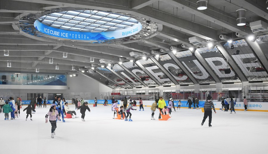 People enjoy skating at the National Aquatics Centre (the "Ice Cube") in Beijing, capital of China, Feb. 4, 2023. (Xinhua/Ren Chao)
