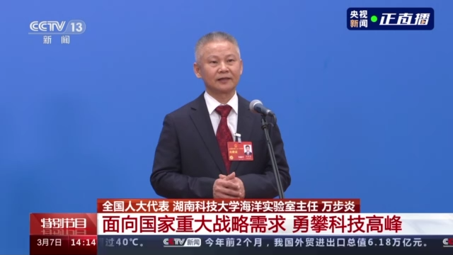 全国人大代表、湖南科技大学海洋实验室主任万步炎表示,多年来我和我的团队秉持着“国家落后于人的地方就是我们努力的方向”这一理念,面向国家重大科技需求,坚定创新自信,勇攀科技高峰,我和我的团队克服重重困难,所有关键技术都从零开始,这些年来,我们一次次刷新了海底钻机的钻深纪录,也一步一步见证了我国深海资源与地质钻探装备技术从无到有,从落后到追赶、到超越的转变。