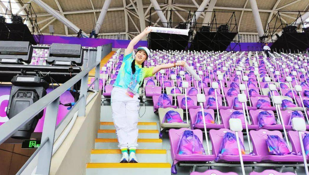 在杭州奥体中心主体育场“大莲花”,浙江理工大学学生陈则骧在开幕式当天负责引导现场观众参与互动。作为当天477名观众服务领域志愿者中的一员,她坚守岗位6个多小时,挥舞双臂、跳跃欢呼,用灿烂的笑容和饱满的热情带动观众,营造热烈氛围。
