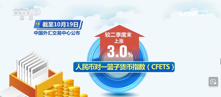 国家外汇管理局10月20日公布我国三季度外汇数据,截至10月19日,中国外汇交易中心公布的人民币对一篮子货币指数(CFETS)较二季度末上涨3.0%。我国稳经济政策持续发力并逐步显效,人民币对美元汇率略有贬值,对欧元、英镑、日元等主要货币有所升值。人民币汇率在全球货币中表现稳健。