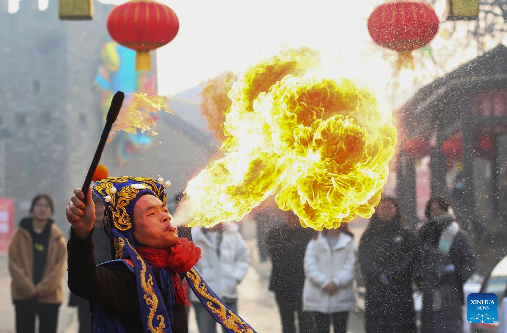 An artist performs fire-breathing at a temple fair in Zaozhuang, east China's Shandong province, Feb. 10, 2024. People across China are enjoying temple fairs, lantern shows and other events to celebrate the Chinese Lunar New Year and embrace the festive atmosphere. (Photo by Li Zhijun/Xinhua)