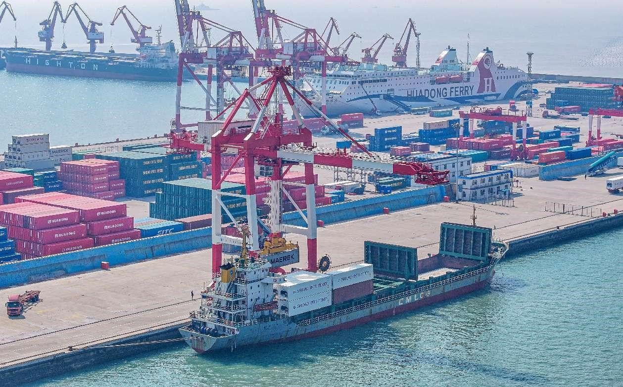 Containers are loaded to and unloaded from cargo vessels at an important transfer hub for cross-border e-commerce in Rongcheng, east China's Shandong province. (People's Daily Online/Li Xinjun)